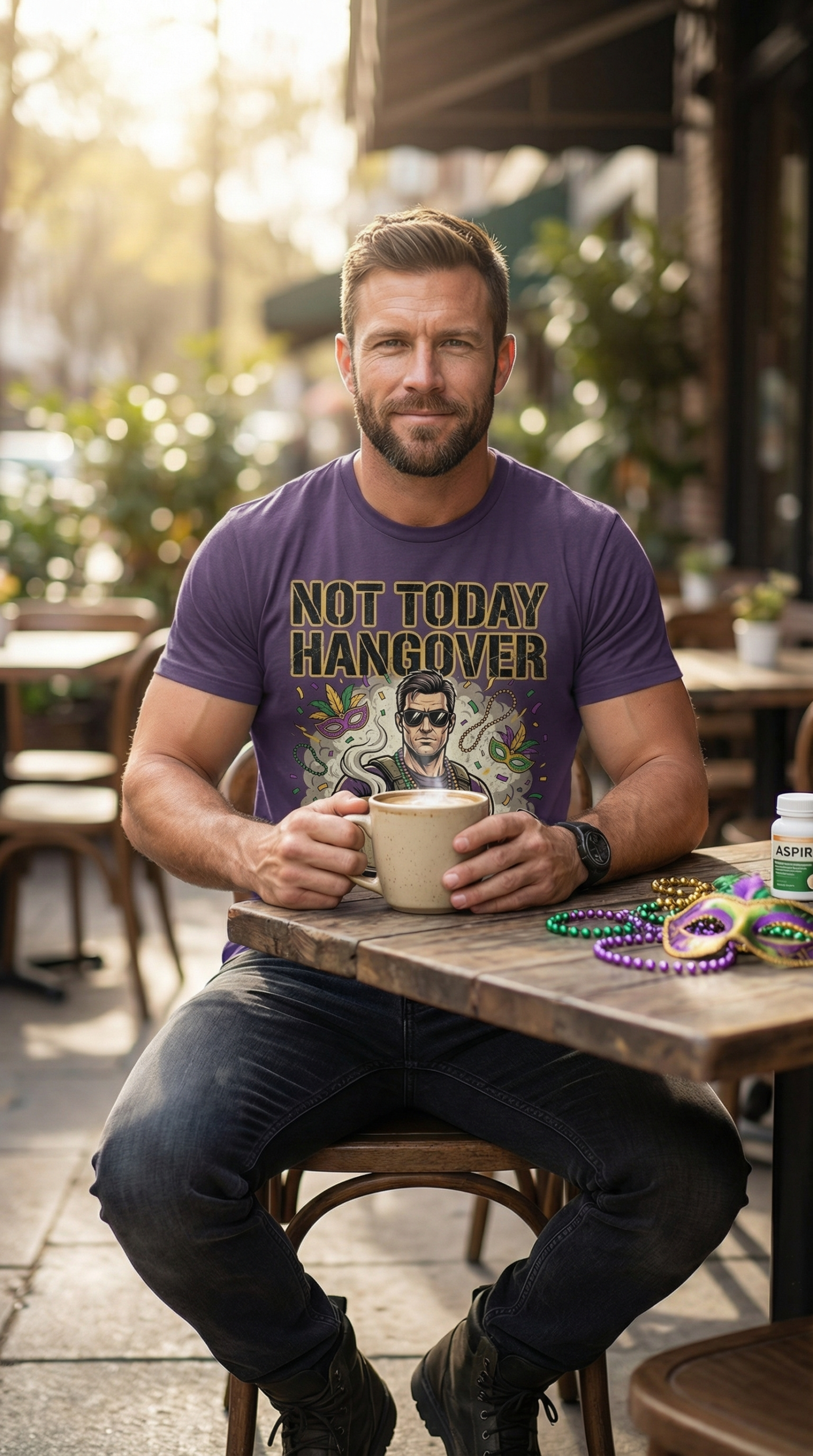 Tactical operator with massive coffee mug and Mardi Gras beads. Because the party doesn’t stop!
